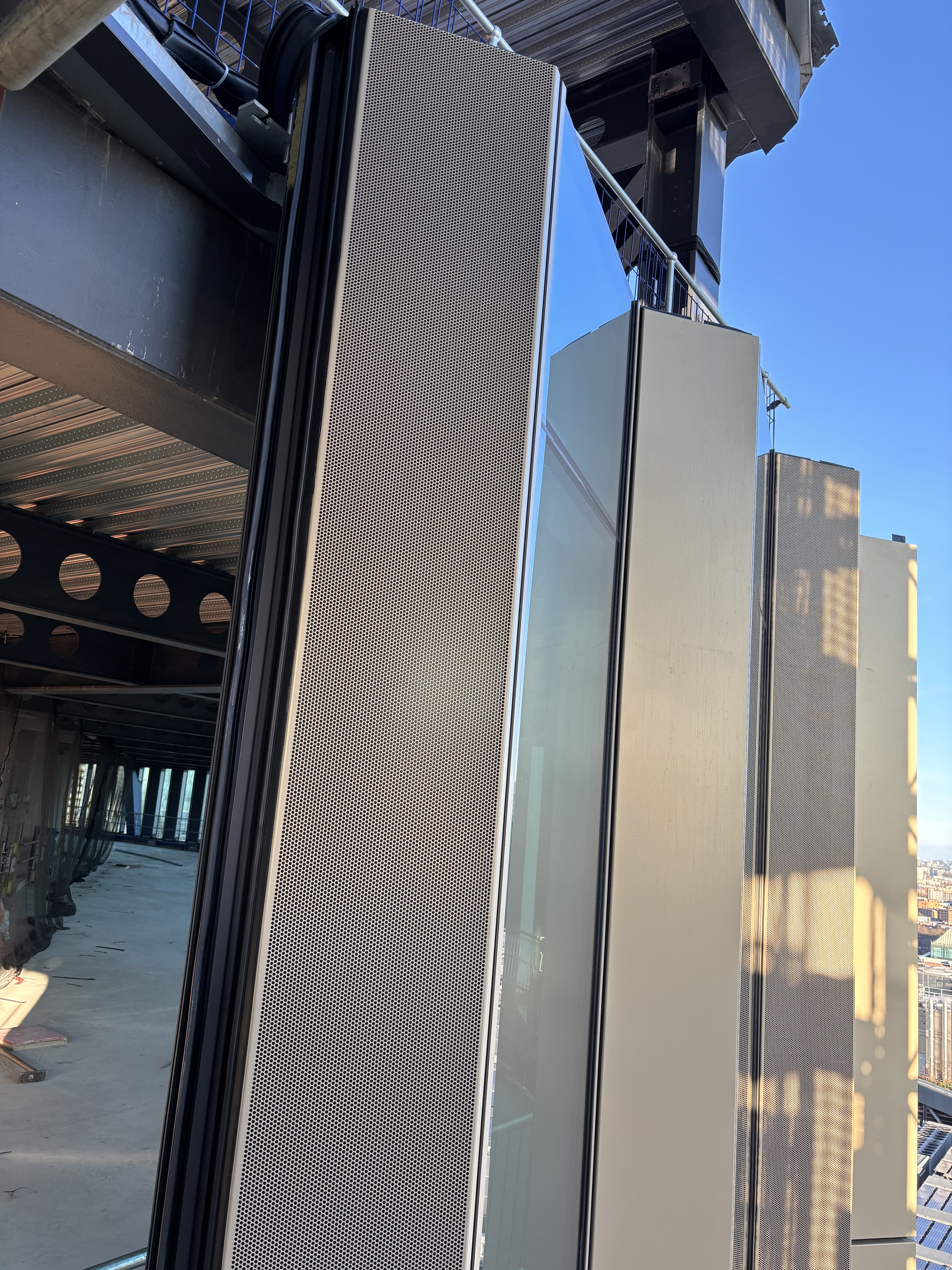 Mit „2 Finsbury“ entsteht im Rahmen der fortlaufenden Neugestaltung des Broadgate Campus gerade eine neue, besonders nachhaltige Landmarke Londons – mit mehr als 100.000 Quadratmeter erstklassiger Nutzfläche in einem zirkulären Design. Das Gebäude wurde als vertikaler Campus konzipiert, der mit vielen Gemeinschaftsräumen Kommunikation und Networking fördern und mit viel Tageslicht und begrünten Erholungsbereichen für Wohlbefinden sorgen soll. Weil Broadgate das größte Fußgängerviertel Londons ist, wird das Gebäude Laufwege erhalten und sich harmonisch in die belebte Umgebung einpassen. Dies soll auch die komplexe, geometrisch ansprechende Gebäudehülle unterstützen, für die Fassadenbauer Focchi im Podium, Ost- und Westturm auf eine modulare, strukturell silikonverglaste Elementfassade mit auffälliger „Sägezahnform“ setzt. Sie besteht aus Sichtbereichen mit hochleistungsfähigen „Stopray Vision 52/27“-Sonnenschutzverglasungen von AGC Interpane, doppelt verglasten Schattenfugen-Brüstungsplatten und opaken Teilen, die außen mit einer auffälligen Aluminiumstruktur verkleidet sind: Teils massiv, teils perforiert mit einer gold-sandfarbenen Oberfläche, durchqueren sie die Türme diagonal in unterschiedlichen Neigungswinkeln und bilden so eine interessante 3D-Geometrie. Hinter den perforierten und goldfarbenen Elementen hat Focchi eine Belüftungslösung integriert, die sich bei Bedarf innen ausfährt und Frischluft zuführt. Im Erdgeschoss kommt ein „Sticksystem“ mit Wärmedämmverglasungen zum Einsatz, das besonders viel Tageslicht in die Räume lässt. Es wurde von AGC Interpane innen und außen mit dem Weißglas „Clearvision“ zu Verbundsicherheitsgläsern aufgebaut und auf Position 5 mit besonders farbneutralen „iplus“-Coatings für exzellente Wärmedämmung beschichtet. Focchi hat zudem die Verkleidung für die Gemeinschaftsbereiche geliefert, die sich mit ihrer dreieckigen Geometrie über mehrere Etagen erstreckt. Zischen dem Ost- und Westturm wird sich später ein Wintergarten mit einem verglasten Oberlicht auf einer tragenden Unterkonstruktion aus laminiertem Holz und Stahl befinden.